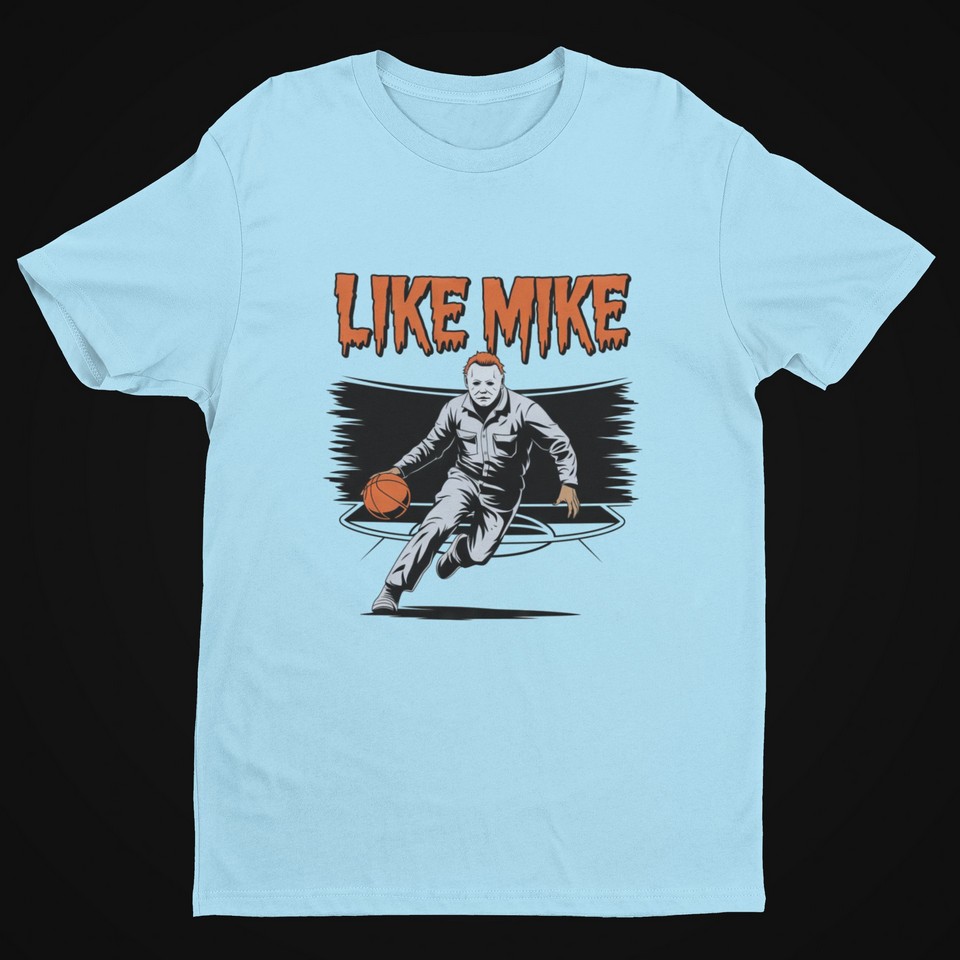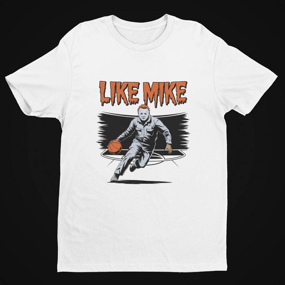 This “Like Mike” T-shirt design brings together the chilling presence of Myers and the high-energy world of basketball. It features Michael Myers in his classic jumpsuit, dribbling a basketball with an intense focus, as if he’s about to make a killer move on the court. The bold, dripping text “LIKE MIKE” adds a hauntingly playful touch, blending horror and sports in a way that grabs attention. Perfect for horror fans and basketball lovers alike, this mashup is a fun and striking statement piece that’s sure to stand out.